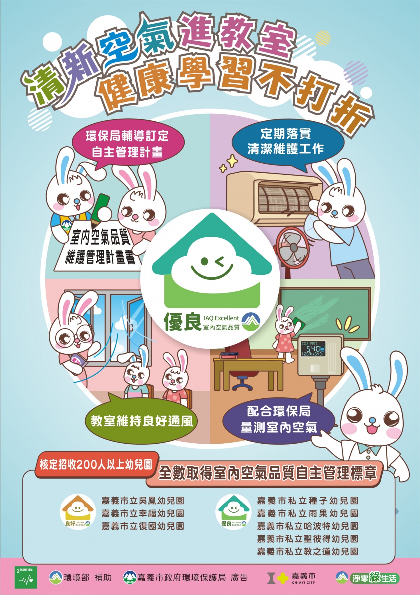 嘉義市政府環境保護局表示,幼兒的呼吸系統尚未發育完全,對空氣品質特別敏感,今年度針對轄內核定招收200人以上之公私立幼兒園加強輔導,透過實地訪查檢視室內外環境與通風狀況,並以儀器量測空氣品質,針對檢測結果提供改善建議及管理指引,協助園所建立室內空氣品質自主管理制度,落實校園日常空品維護管理。經輔導後各幼兒園不僅強化環境清潔、空調與風扇設備的維護,也正確運用開窗與換氣設備維持良好通風環境,並選用具環保標章低揮發性產品,有效提升了室內空氣品質,最終全數順利取得室內空氣品質自主管理標章。