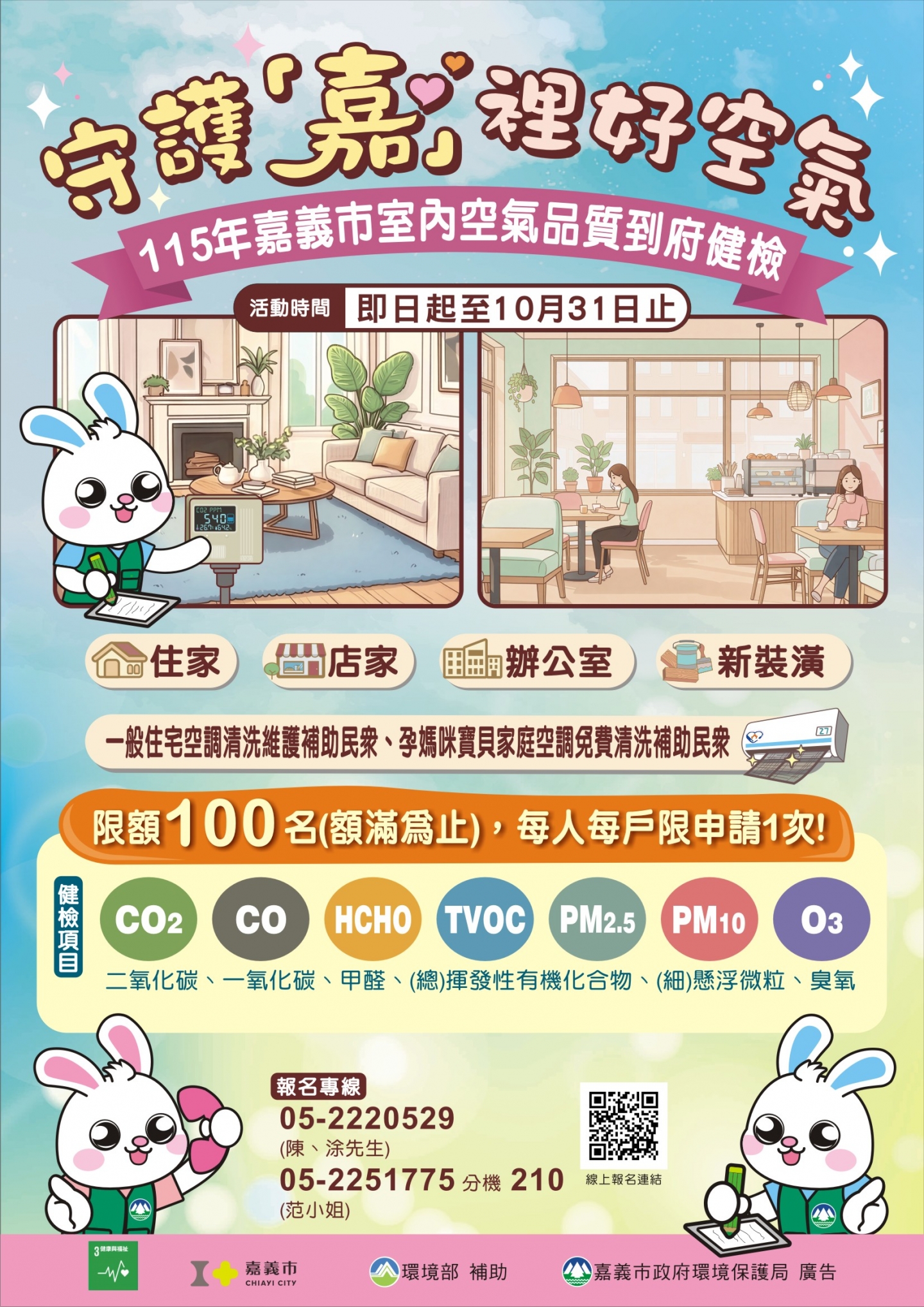 為提升市民居住與工作環境室內空氣品質,嘉義市政府環境保護局今(115)年持續推出免費「到嘉診斷」室內空氣品質檢測服務,活動自即日起至10月31日止,凡轄內住家、店家、辦公室及新裝潢場所皆可申請,由該局專業人員攜帶直讀式儀器到場檢測,協助民眾掌握室內空氣品質狀況,並提供改善與維護建議,同時結合住宅空調清洗維護補助計畫,鼓勵民眾透過冷氣清洗進一步提升居家空氣品質,想了解所處環境室內空氣品質之市民朋友,請把握機會踴躍申請。
